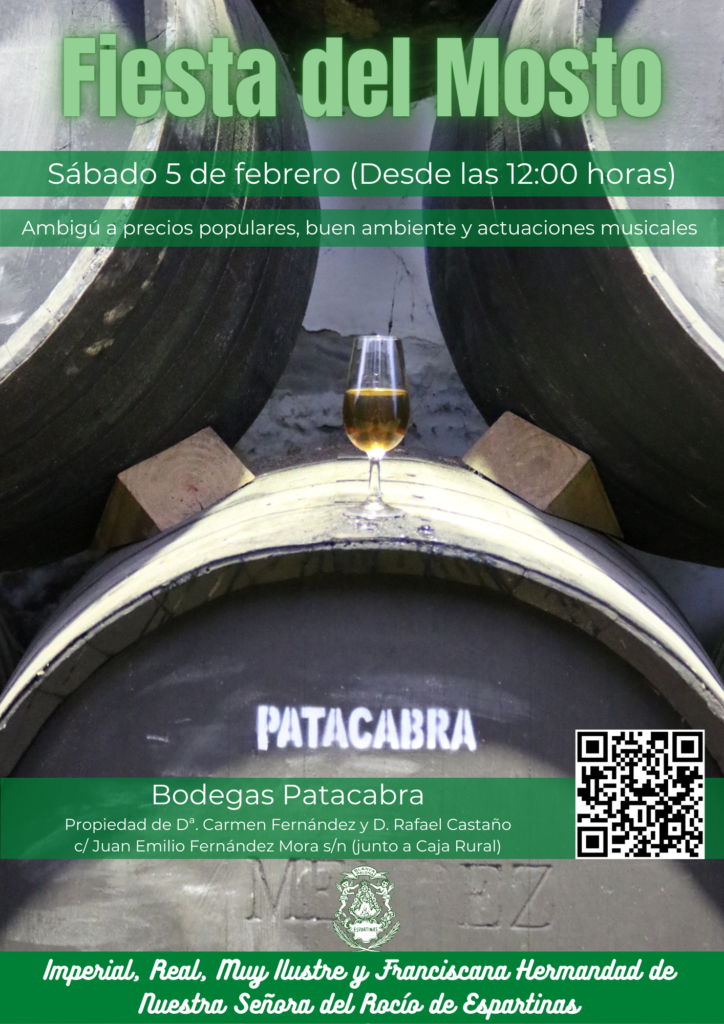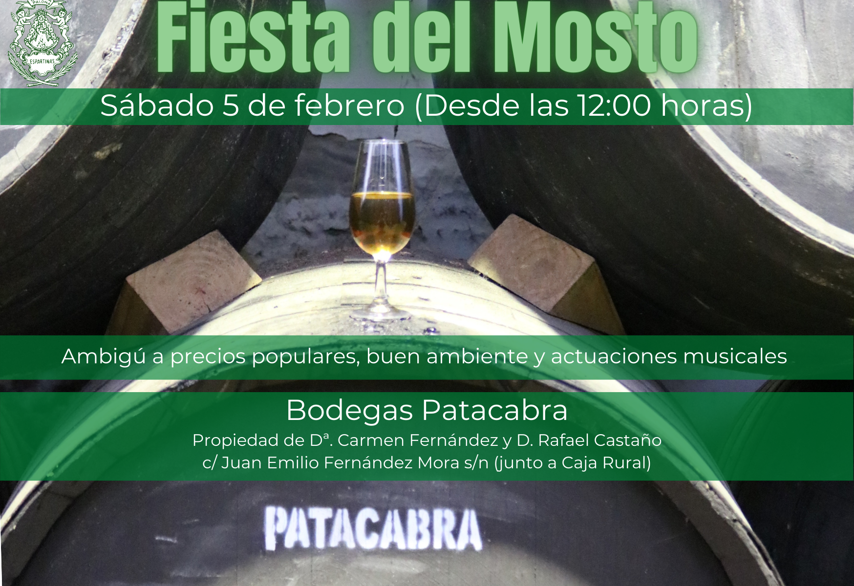 La tradicional Fiesta del Mosto, que organiza la Hermandad, se celebrará el próximo sábado 5 de febrero en Bodegas Patacabra (c/ Juan Emilio Fernández Mora s/n, junto a la Caja Rural), a partir de las 12.00 horas.