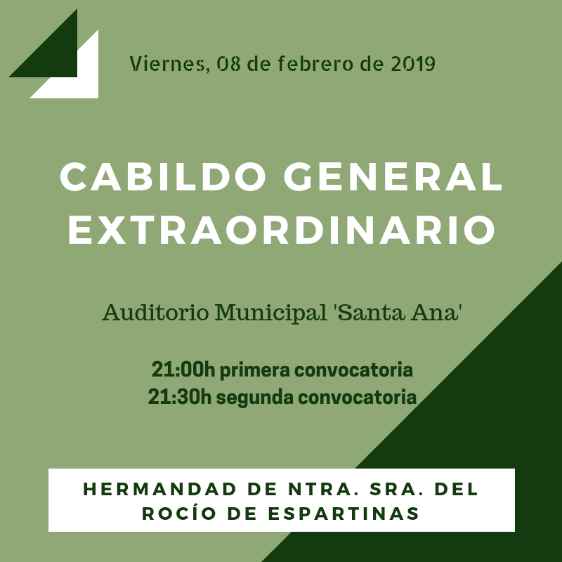 Por orden del Sr. Presidente, previo acuerdo en Cabildo de Oficiales de esta Hermandad el pasado día 14 de enero del presente, y de conformidad a lo preceptuado en el Art. 33 de nuestras Reglas, “Los Cabildos Generales Extraordinarios se celebrarán siempre que la Junta de Gobierno lo estime necesario o cuando lo soliciten formalmente por escrito un número de hermanos no inferior a 30 y que tengan, como mínimo, un año de antigüedad (…)”, cito a usted a asistir al Cabildo General Extraordinario que D.m. se celebrará el próximo día 8 de febrero de 2019 a las 21:00 horas la primera convocatoria, y a las 21:30 horas la segunda y última convocatoria, en el Auditorio Municipal Santa Ana de Espartinas, con arreglo al siguiente Orden del Día: