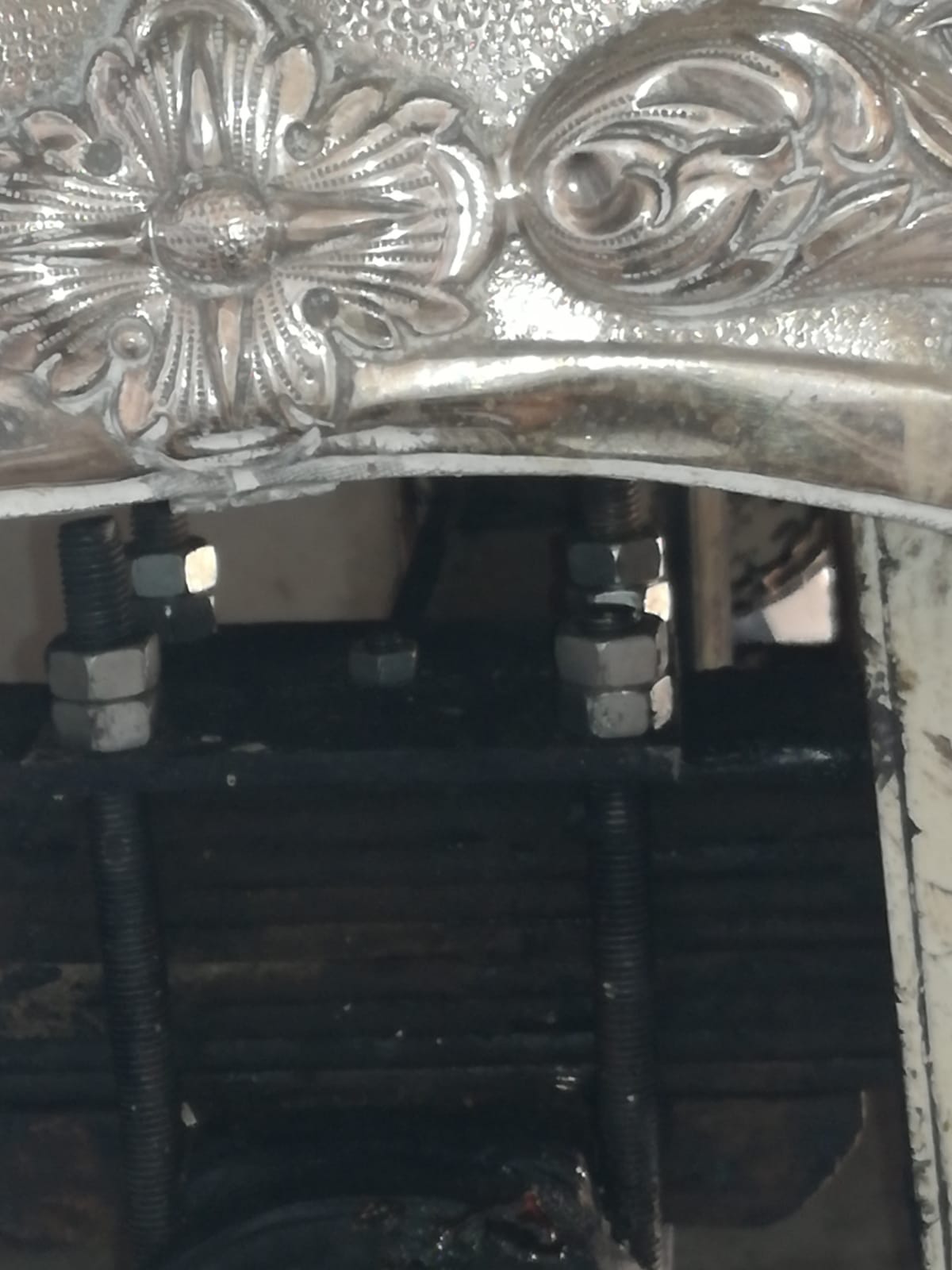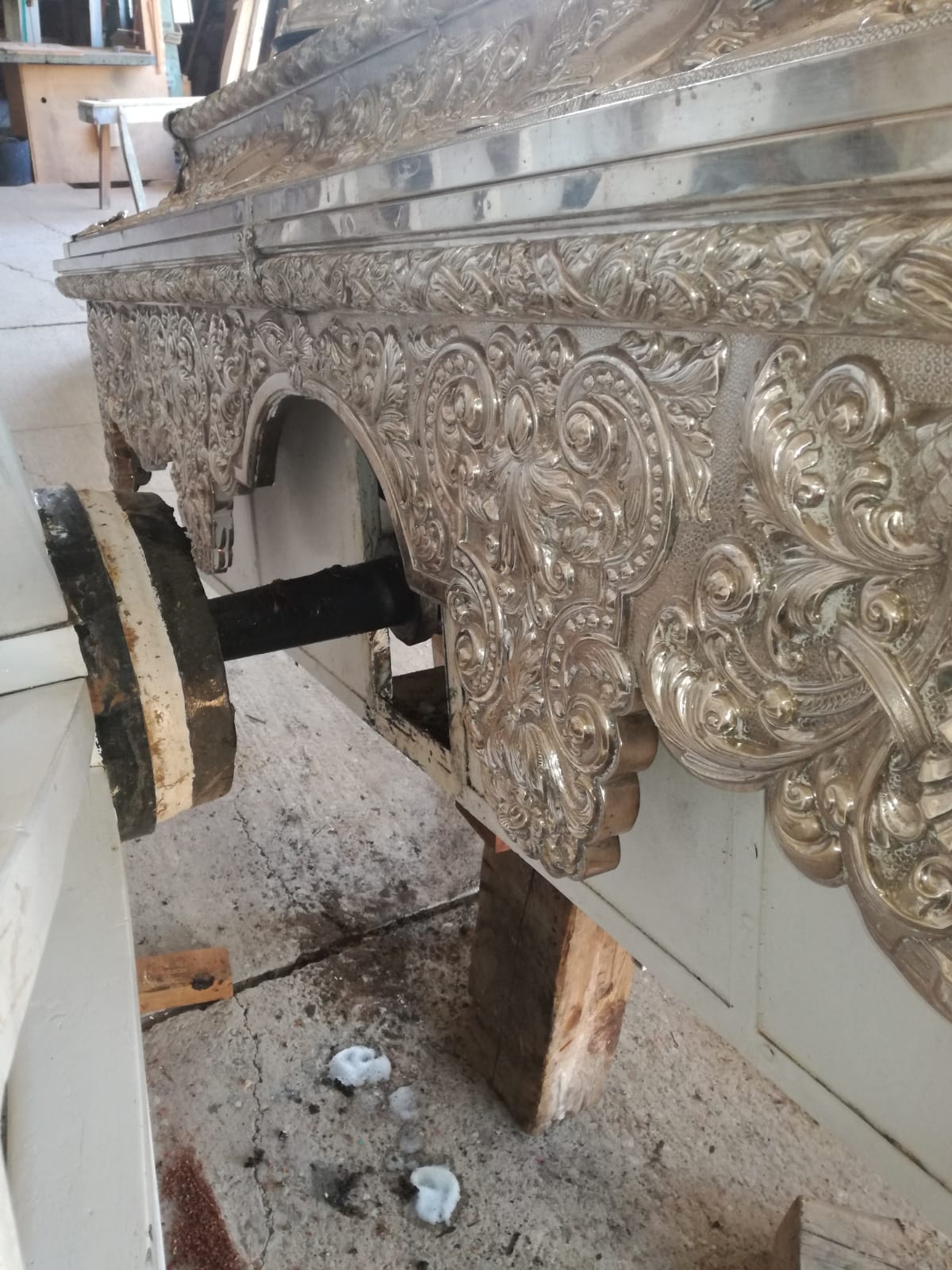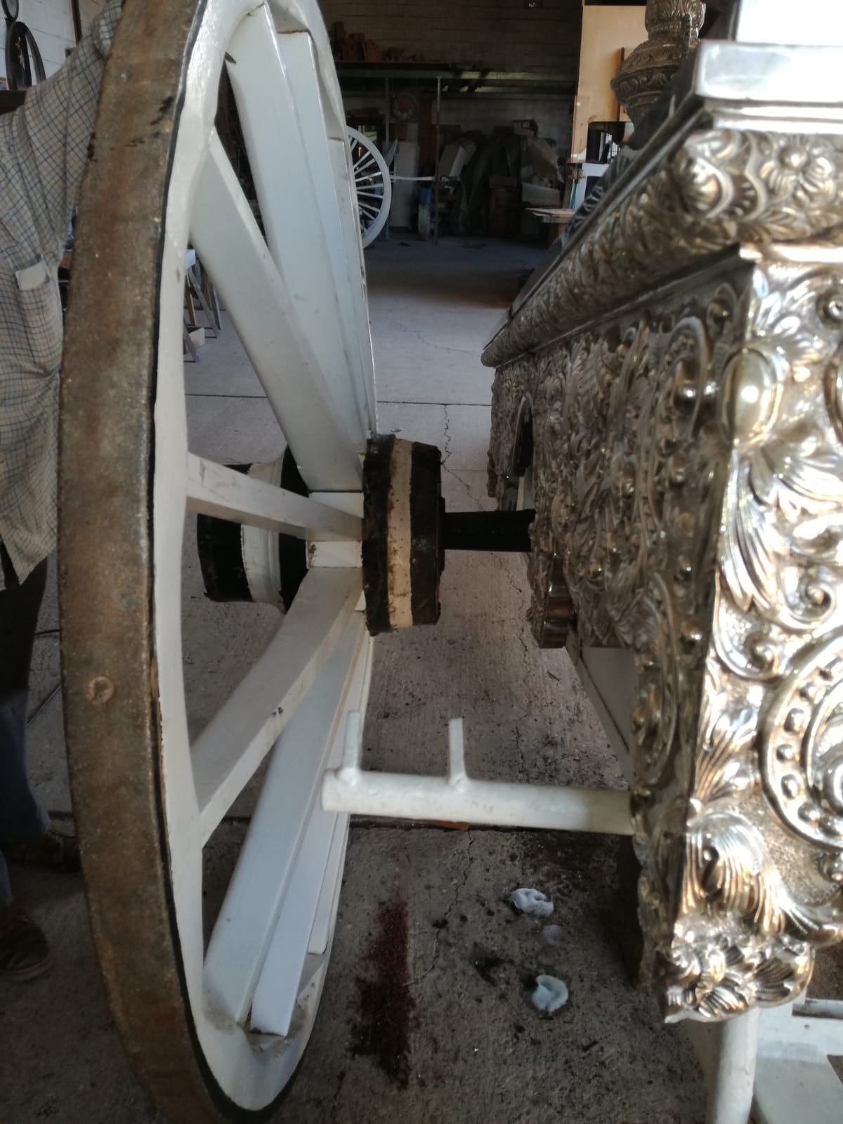 Debido a estos desperfectos se aconseja a la Hermandad el cambio urgente de muelles y ruedas, debido al alto índice de siniestralidad en un futuro. Estos fueron los motivos por los que se trasladó la Carreta de Plata a mi taller.