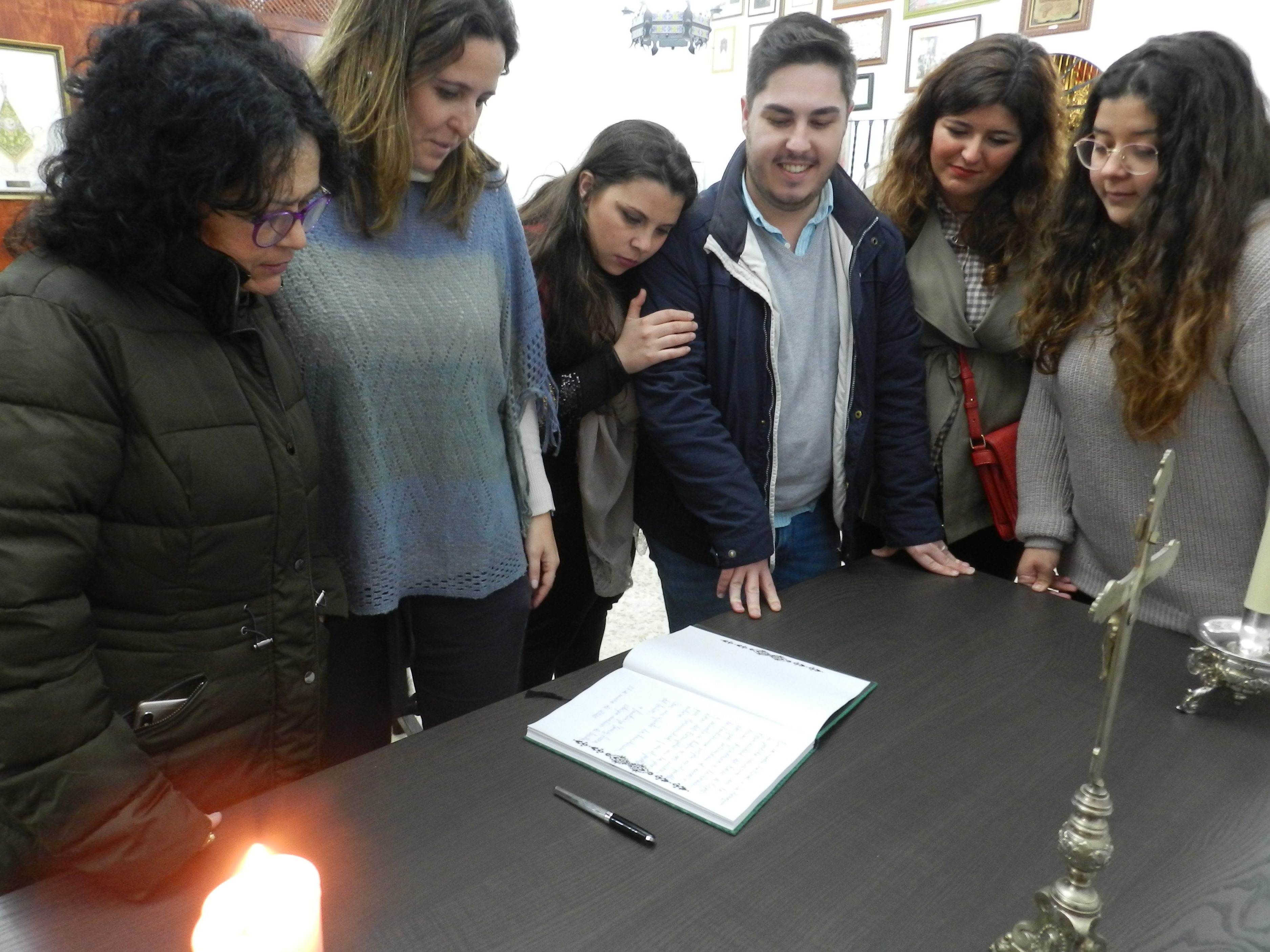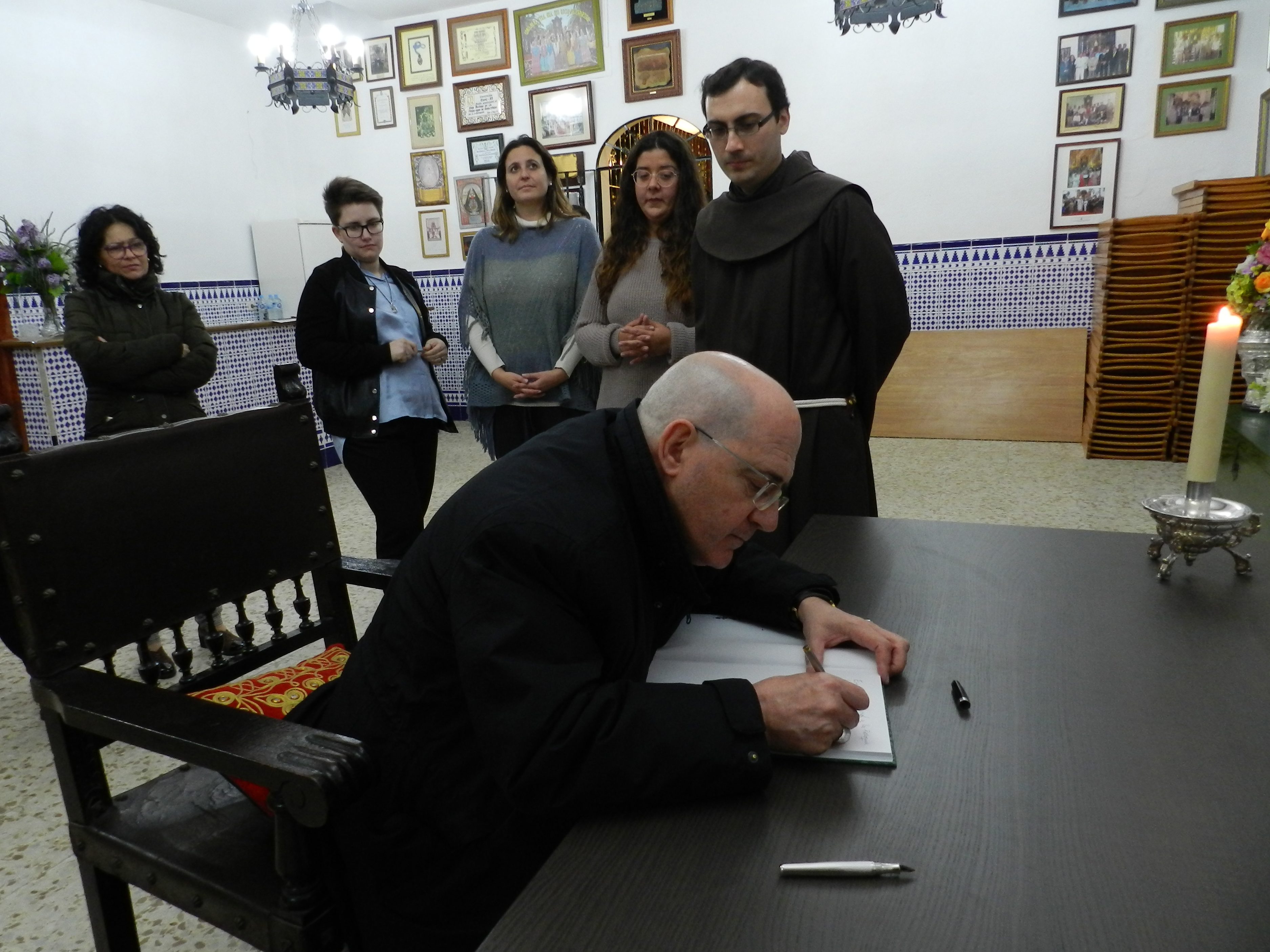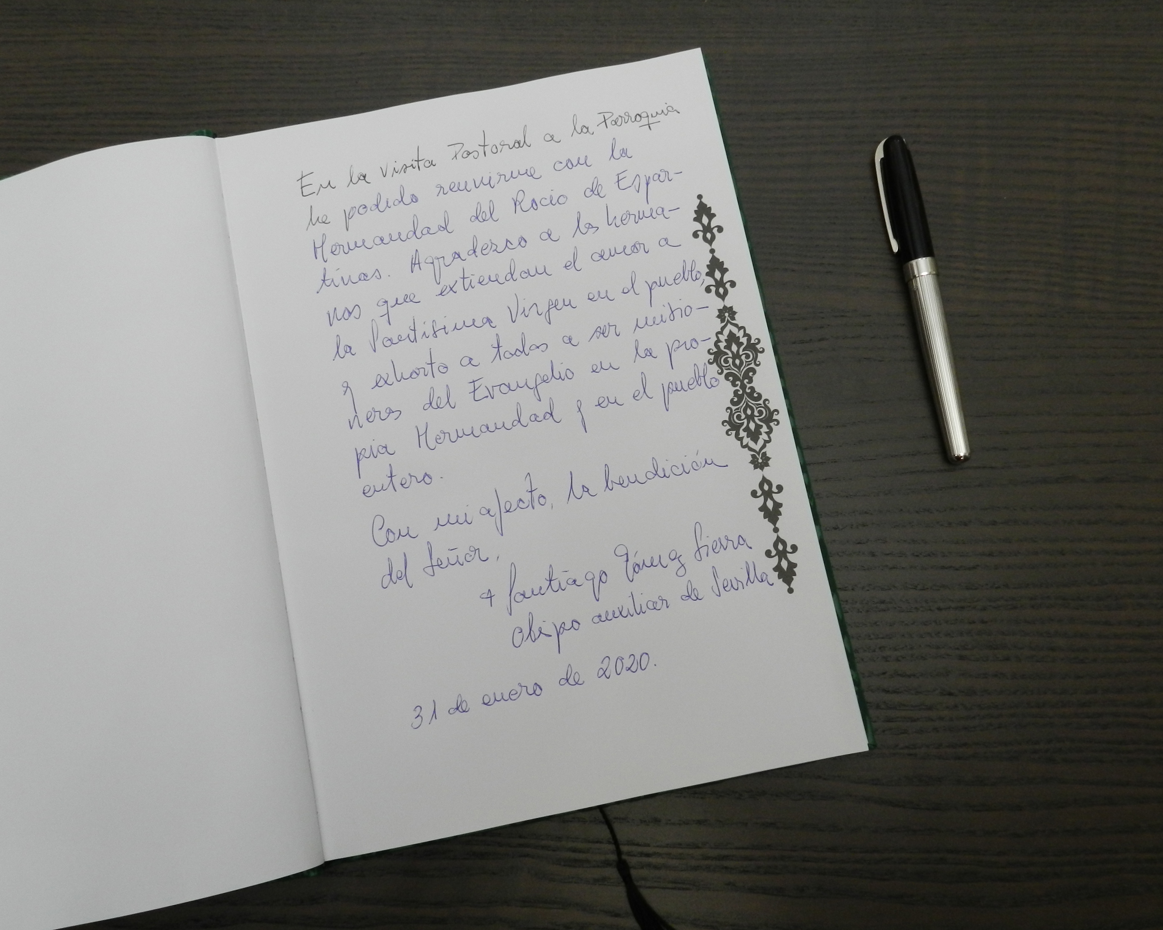 Para que quede constancia en nuestra hermandad de este hito tan importante, el obispo auxiliar dejó su huella en un libro de visitas que la Junta de Gobierno le proporcionó. Después de un tiempo sentado frente al azulejo de María Santísima del Rocío que preside la sala, dejaba escrito el siguiente mensaje: «En la Visita Pastoral a la parroquia he podido reunirme con la Hermandad del Rocío de Espartinas. Agradezco a los hermanos que extiendan el amor a la Santísima Virgen en el pueblo, y exhorto a todos a ser misioneros del Evangelio en la propia hermandad y en el pueblo entero. Con mi afecto, la bendición del Señor. + Santiago Gómez Sierra, obispo auxiliar de Sevilla. 31 de enero de 2020″.